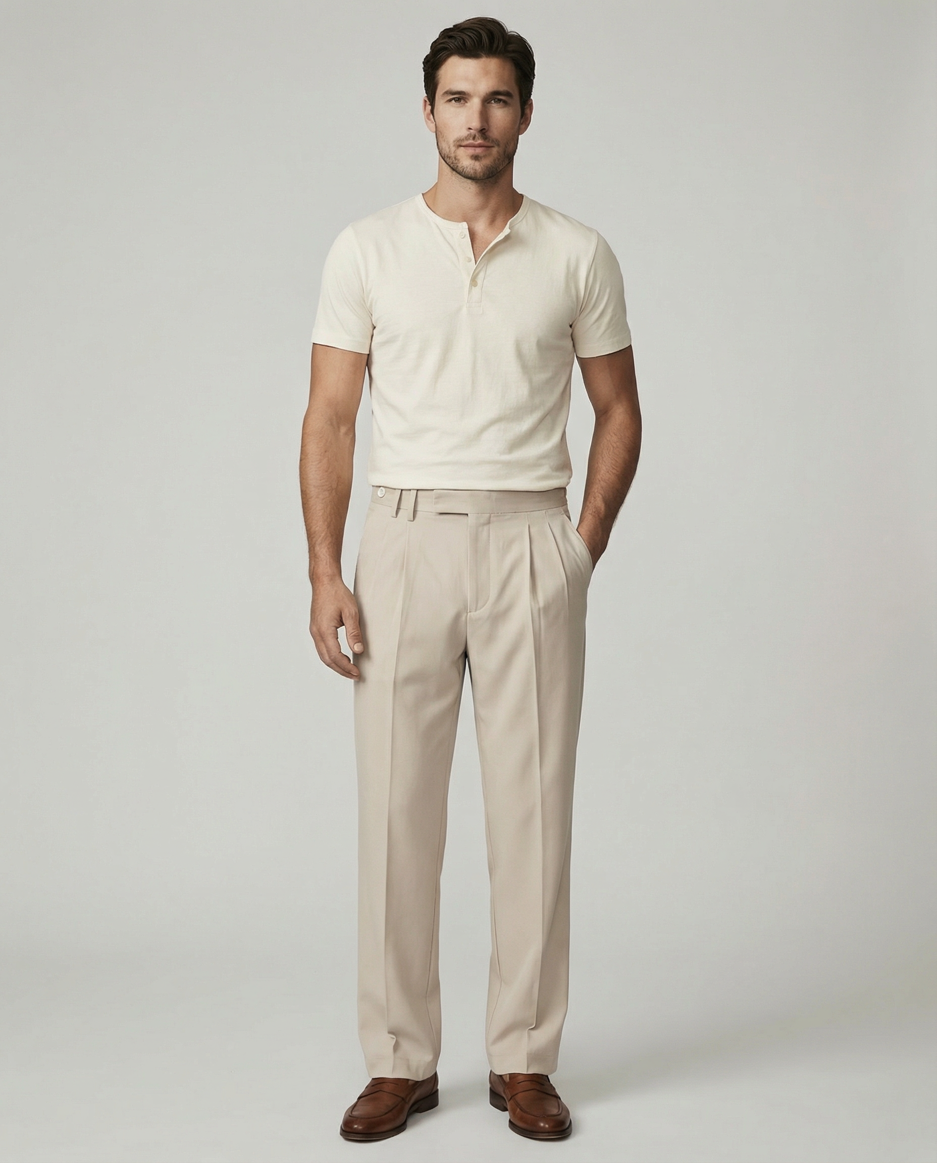 Pleated trousers with a cropped hem that hits right at the ankle. Not full-length, not shorts—the in-between that makes your entire silhouette look more intentional.
